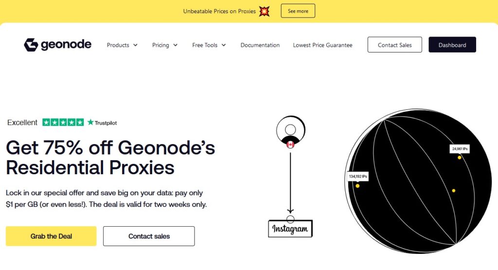 Geonode is a proxy service provider that offers unlimited residential proxies at a very competitive price. With a network that spans over 160 countries, Geonode ensures a 99.9% success rate and offers SOCKS5/HTTPS support.Geonode’s unlimited residential proxy service provides unlimited data and a progressive latency feature, ensuring reliable and efficient web scraping. Users can exceed the premium data allowance threshold before experiencing any latency, which only affects a small percentage of users. With the best price per GB on the internet, Geonode’s service is both affordable and valuable for your web scraping needs.Geonode also offers a pay-as-you-go scraper API that makes web scraping easy and efficient for developers of all skill levels. This API handles proxies, browsers, and captchas with just a simple API call.Geonode’s key features include instant activation with multiple locations, continuous proxy rotation, and a developer-friendly API that allows for straightforward integration with any application.