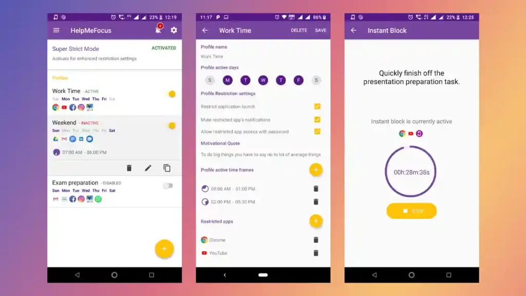 This flexible program lets you establish personalized modes, allowing you to choose the days and hours when it operates. With HelpMeFocus, you can customize your experience by deciding how to restrict distractions, applications, and smartphone use.