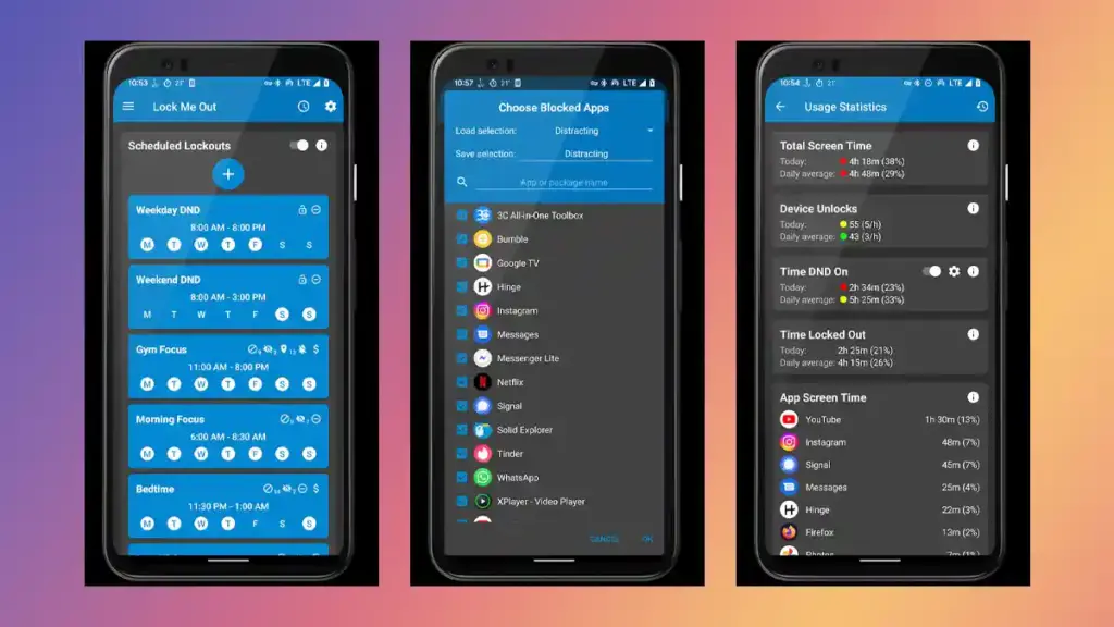 App blocking, selective app permissions, website blocking, automated locks, location-based locks, and extensive use data are some of the features offered by Lock Me Out. Best of all, this ad-free software is 100% free and devoted to efficiently combating social media and smartphone addiction.”