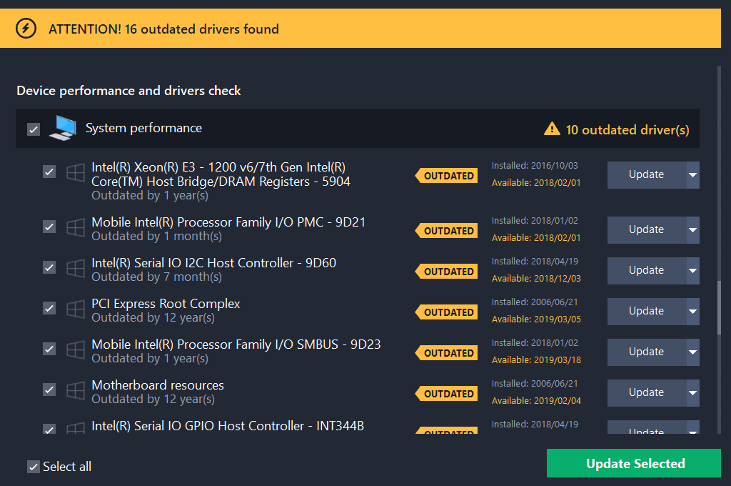 It’s also up to you whether you want to update all drivers. If you want to skip some of them, simply select ‘Ignore’ instead of ‘Update’. When you’ve made your selection, click on the green ‘Update Selected’ button.