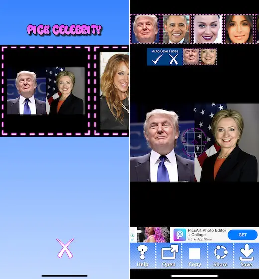 Face Swap Live and Face Swap Booth applications, which come with preset celebrity faces, may be used to switch faces with celebrities. You may also do an image search to switch to any celebrity.