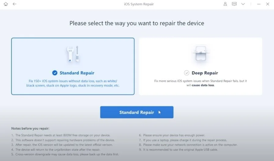 ReiBoot shows you 2 repair options. Going for deep repair may delete your data, so we will stick with standard repair and click the Standard Repair button below. Most iOS system issues can be solved by standard repair.