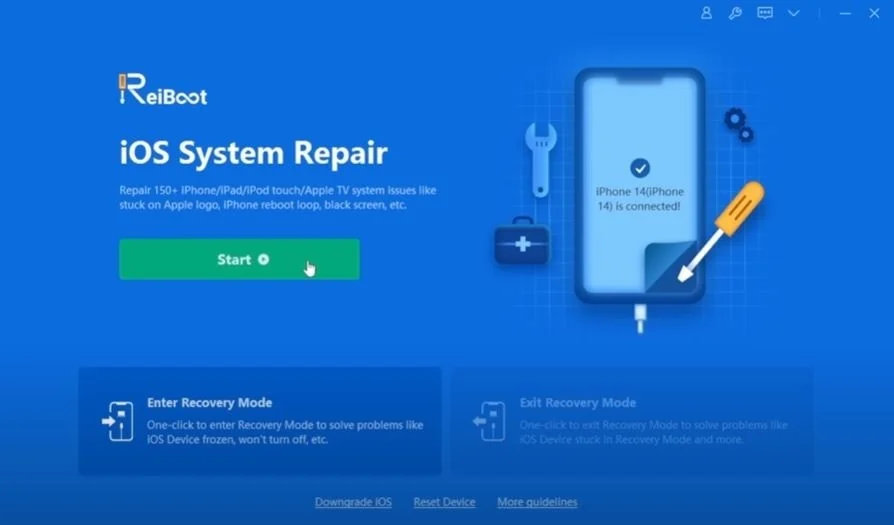 Open ReiBoot on your computer and connect iPhone 14 to it using the USB-C to lightning cable that comes with your iPhone. Click “Start” to begin.