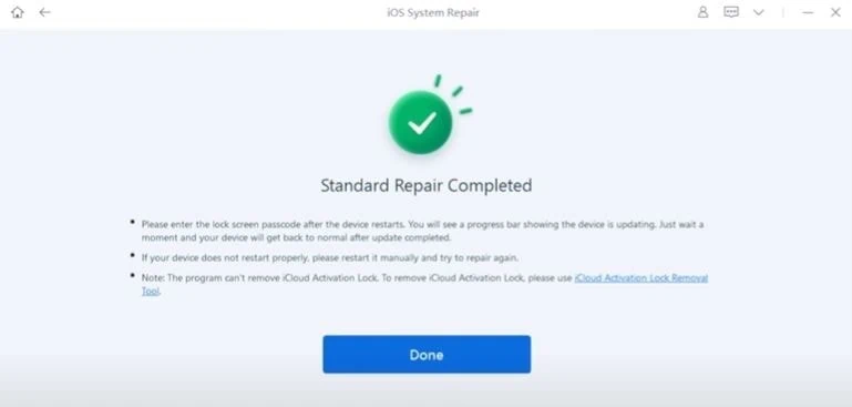 After the repair, you will see a screen showing a success message. Click Done, and then you may disconnect your iPhone. With these steps, you will have the issue with your iPhone resolved.