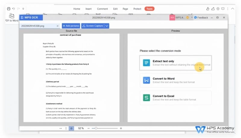 You must install the WPS PDF tools in order to use the OCR capability. Once installed, it is simple to extract text from imported information. You may also convert the file to Word or Excel after extracting the contents.