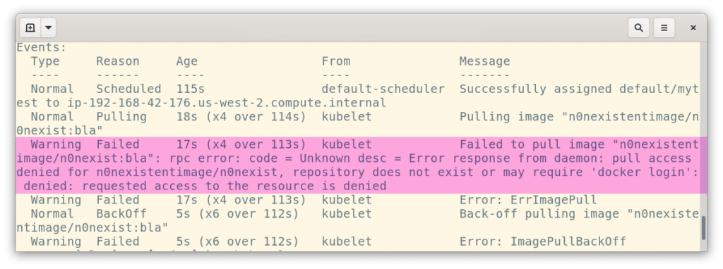 For instance, if you have a pod referencing an image that does not exist, you’ll get an Events output from kubectl describe <pod name> that looks something like this: